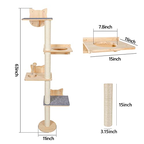 - More Stable and Wear-resistant for Long-term Use: Each cat pole for scratching is 15inch high, 3inch in diameter, and is wrapped with natural sisal rope. Compared with paper tube the other post use, the inner core of our cat post is made of more tough and durable PVC, and not easy to be damp. We use solid pine wood, 0.6in thick, the size of each catwall shelves is 15*11in, most importantly with a larger base that is 11in in diameter.
