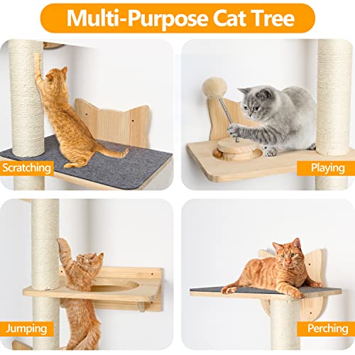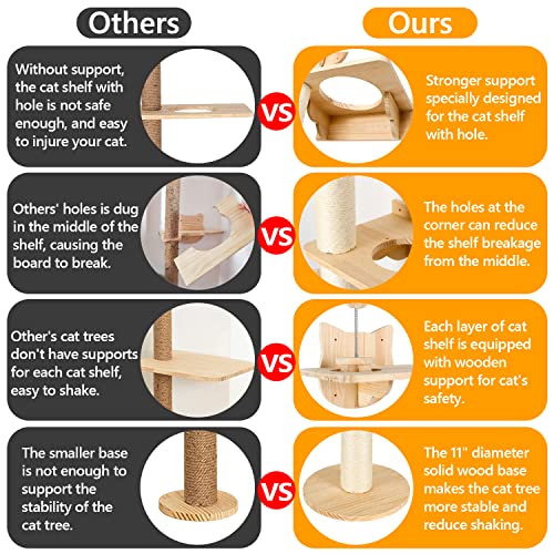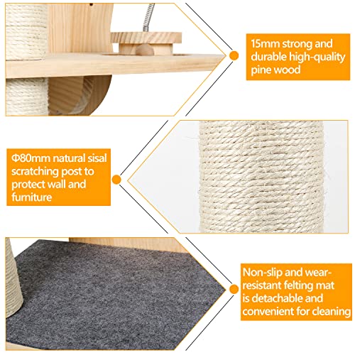 - Multi-layer Home Playground Indoor for Your Cat: The cat activity tree consists of 4 cat scratch posts and 4 cat wall shelves, on which we have different designs to attract cats. The cat shelves on the first and fourth layers are equipped with felt pad for non-slip, there are wooden track toy ball and cat pom-poms with springs on the second layer, and a 20cm hole is dug on the third layer for your cats to jump up and down.