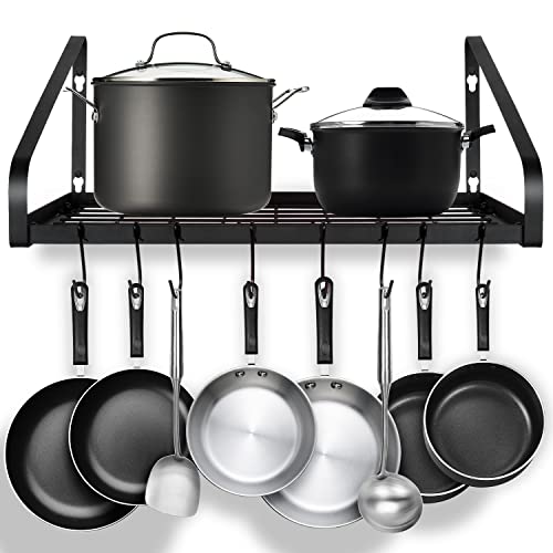 - 🔥〖SIMPLE STYLISH MULTIFUNCTION STORAGE SHELF〗Wall Mounted Pot Rack can save more table space. Simple and thoughtful design to show a stylish kitchen, suitable for any decoration styles in kitchen. Besides kitchen storage, wonderful wall storage shelf is very suitable for study, balcony, living room, coffee shops and restaurants.