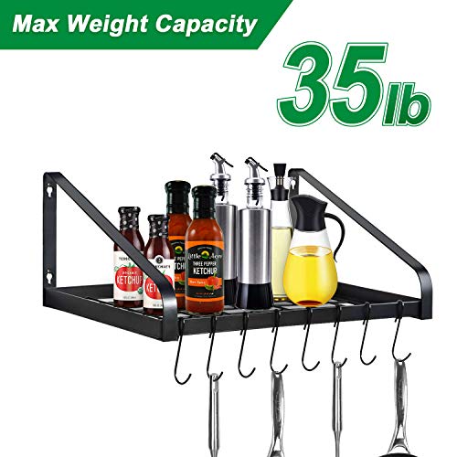 - 🔥〖STRONG WEIGHT CAPACITY〗Rack dimension: 17 inch X 12.2 inch X 7 inch (LXWXH) with 8 moveable hanging hooks. You can put lots of stuffs on the large kitchen cookware wall shelves on the 8 hanging hooks. The max weight capacity of the kitchen cookware wall shelves is 35 lb. With 4 large screws and 4 wall anchors, the wall mounted pot rack can stay safe on the wall even numbers of kitchen utensils.